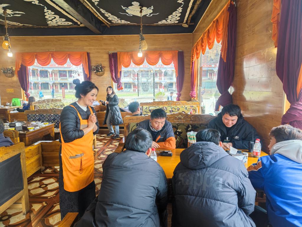 德吉旺姆(左一)正在农庄招待前来就餐的游客(3月26日摄)。新华社记者王泽昊 摄