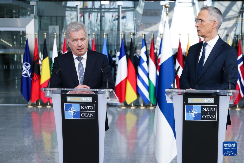 4月4日,在比利时布鲁塞尔的北约总部,芬兰总统尼尼斯托(左)和北约秘书长斯托尔滕贝格对媒体发言。新华社记者郑焕松摄
