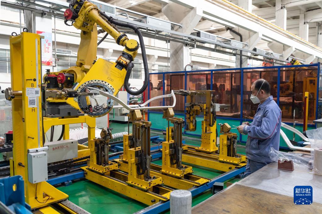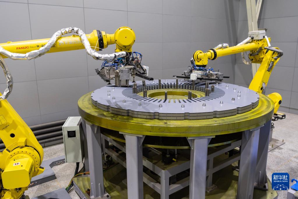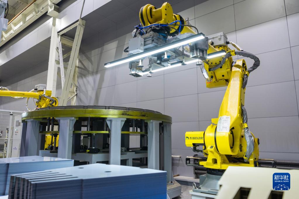 在哈电集团哈尔滨电机厂有限责任公司的生产车间,智能叠片机器人在进行自动化作业(3月29日摄)。新华社记者 谢剑飞 摄