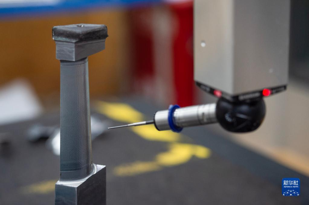 在哈电集团哈尔滨汽轮机厂有限责任公司叶片分厂数字化(智能)车间,三坐标测量机在测量工件的有关数据(3月29日摄)。新华社记者 谢剑飞 摄