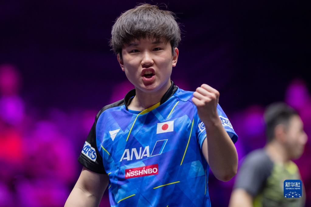 4月19日,日本选手张本智和在比赛中庆祝得分。新华社记者 张金加 摄