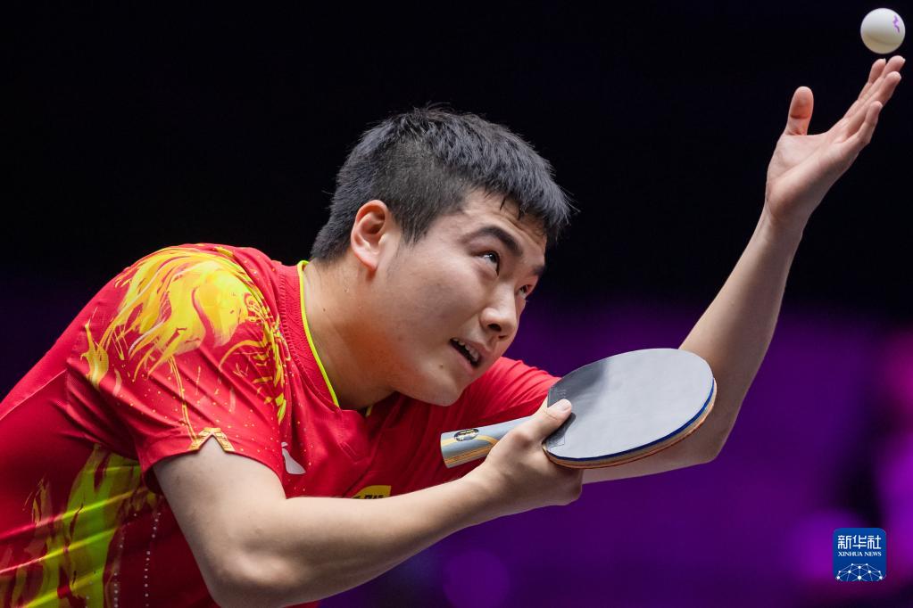 4月20日,中国选手梁靖崑在比赛中发球。新华社记者 张金加 摄