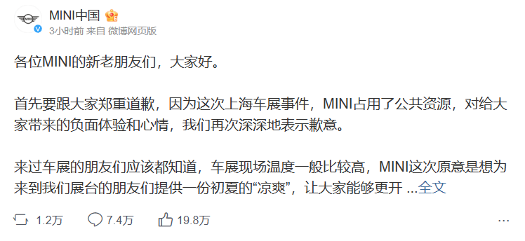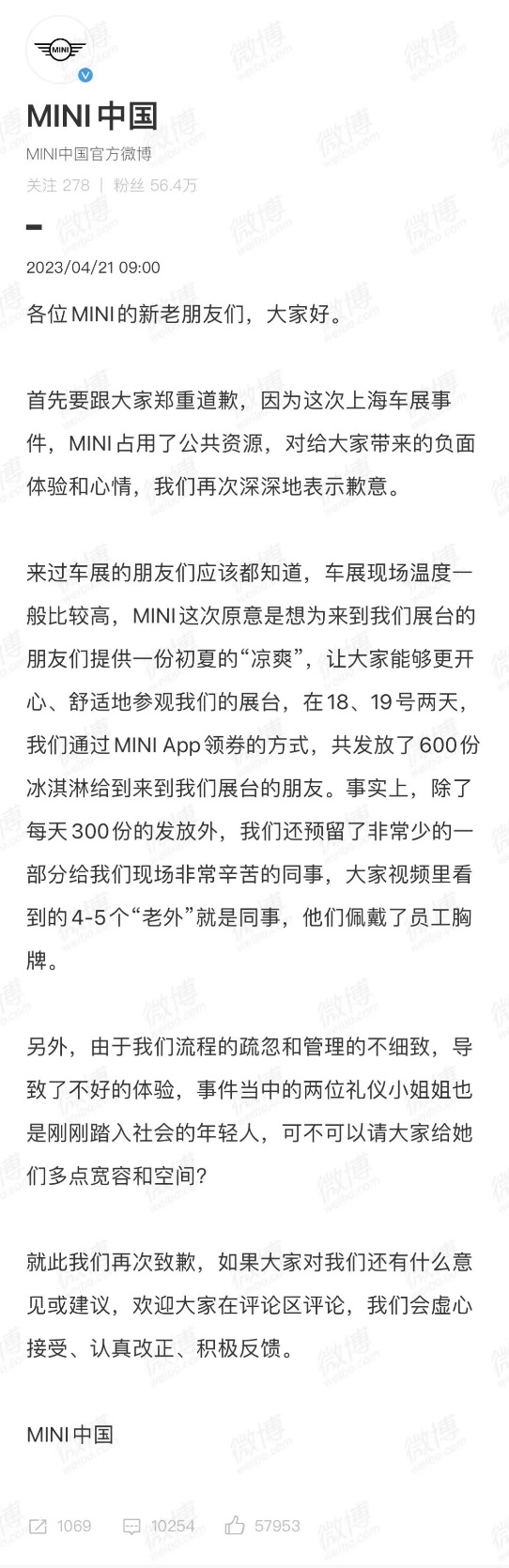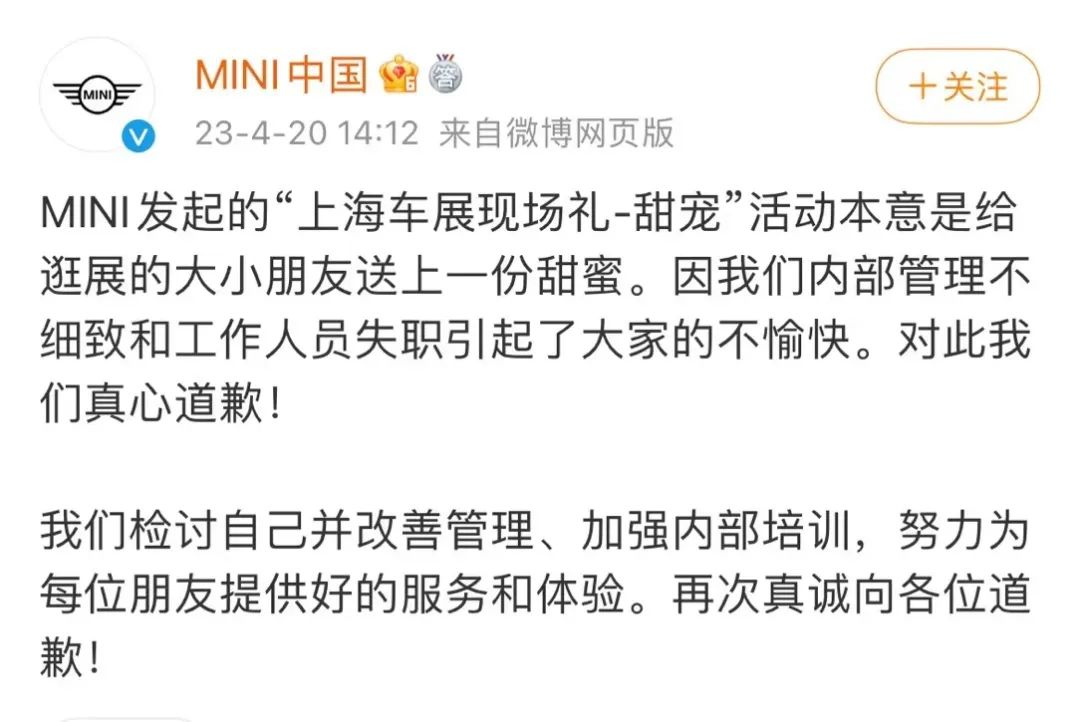 4月20日下午,宝马MINI通过微博@MINI中国发文道歉,表示发放冰激凌活动的本意是给逛车展的大小朋友送上一份甜蜜。但因内部管理不细致和工作人员失职引起了大家的不愉快。对此道歉。