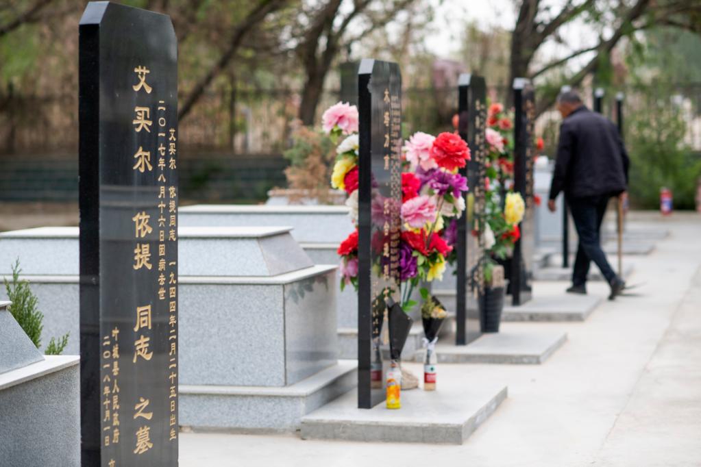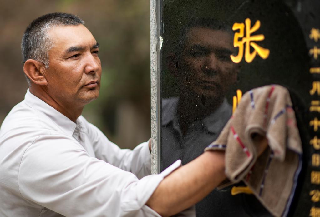 4月16日,艾尼瓦尔·艾买尔在叶城烈士陵园擦拭墓碑。
