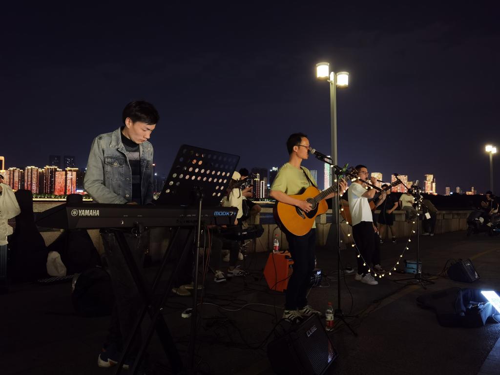 一支青年乐队在长沙湘江风光带表演节目。新华社记者白田田 摄