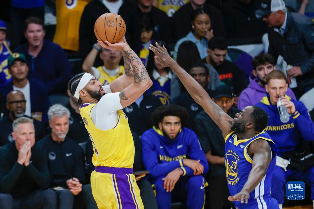 5月8日,湖人队球员安东尼·戴维斯(左)在勇士队球员德雷蒙德·格林防守下投篮。新华社发(赵汉荣摄)