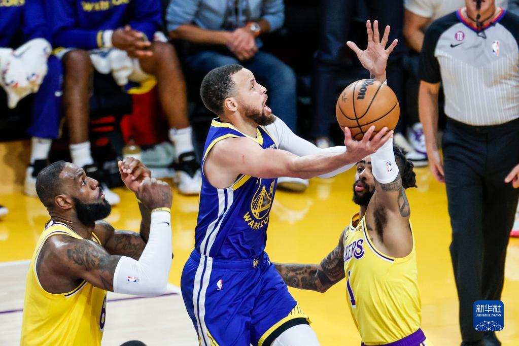 5月8日,湖人队球员勒布朗·詹姆斯(上)在勇士队球员斯蒂芬·库里(左)、德雷蒙德·格林防守下投篮。新华社发(赵汉荣摄)