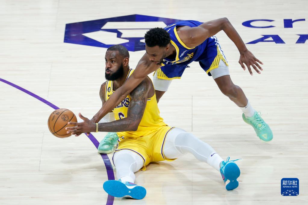 5月8日,湖人队球员勒布朗·詹姆斯(左)与勇士队球员安德鲁·维金斯在比赛中拼抢。新华社发(赵汉荣摄)