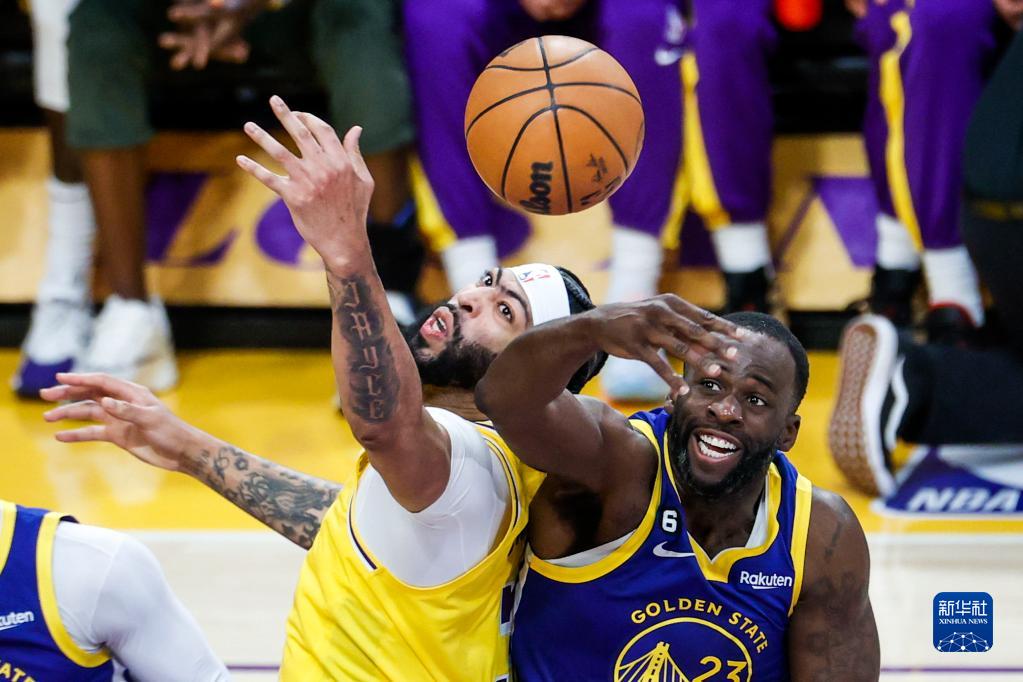 5月8日,湖人队球员安东尼·戴维斯(左)与勇士队球员德雷蒙德·格林在比赛中拼抢。新华社发(赵汉荣摄)