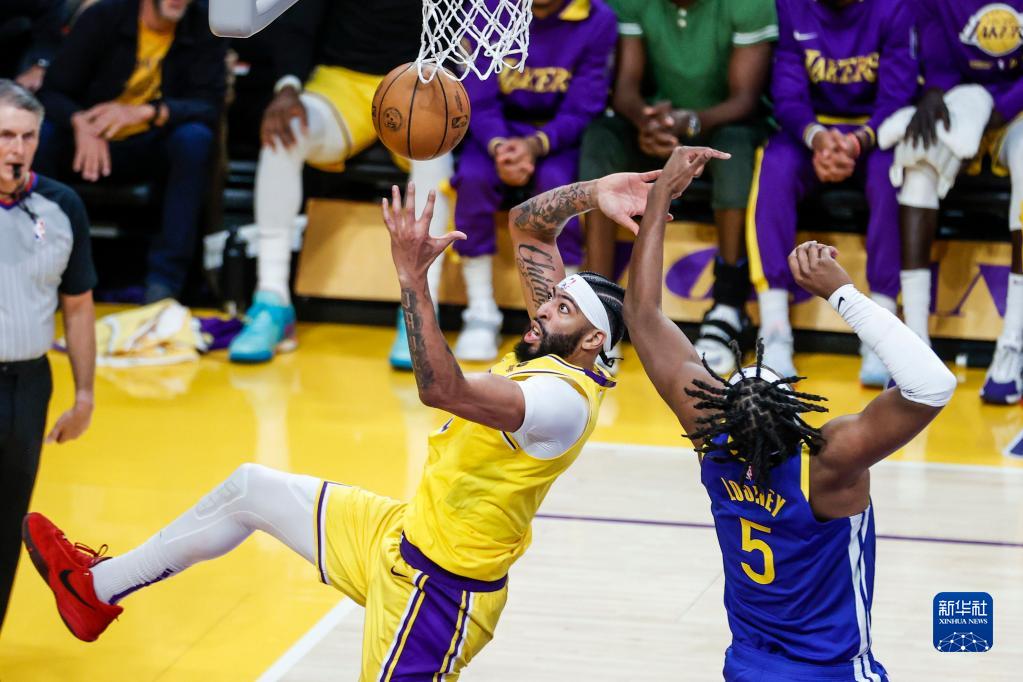 5月8日,湖人队球员安东尼·戴维斯(左)与勇士队球员凯文·鲁尼在比赛中争抢篮板球。新华社发(赵汉荣摄)