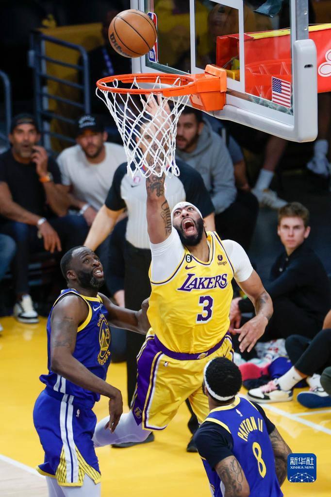5月8日,湖人队球员安东尼·戴维斯(中)在比赛中上篮。新华社发(赵汉荣摄)