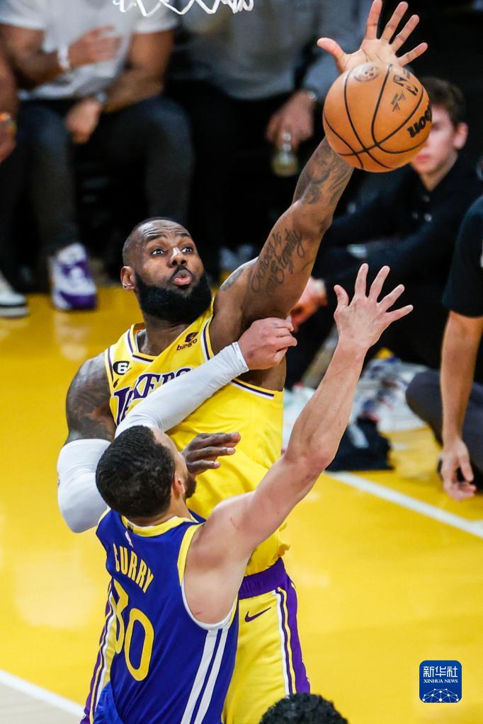 5月8日,湖人队球员勒布朗·詹姆斯(上)在比赛中封盖勇士队球员斯蒂芬·库里的上篮。新华社发(赵汉荣摄)