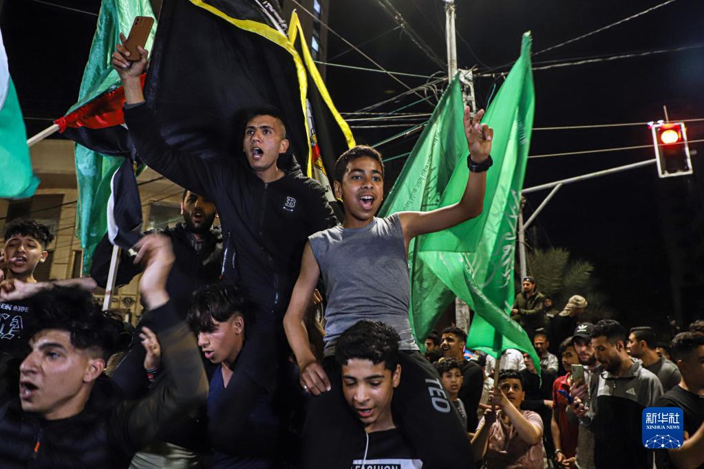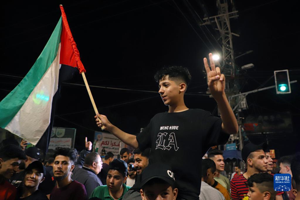 5月13日,巴勒斯坦人在加沙城街头庆祝停火协议达成。新华社发(里泽克·阿卜杜勒贾瓦德摄)