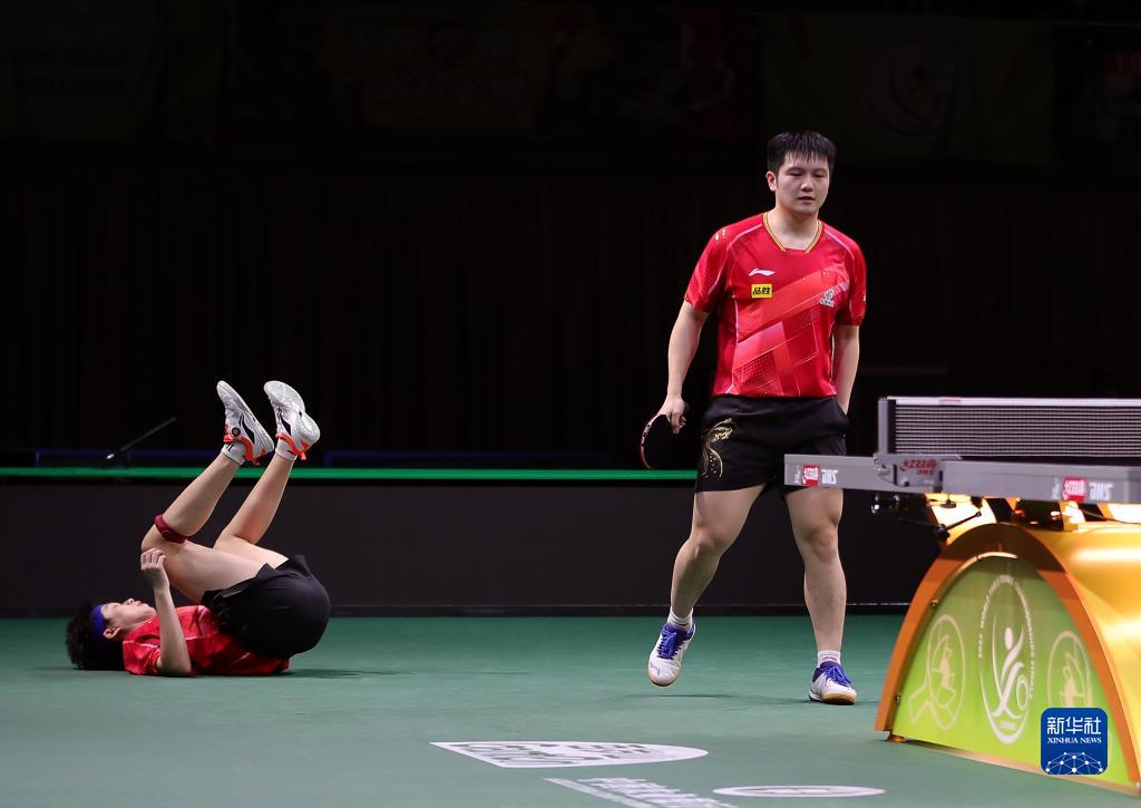5月25日,王楚钦(左)在比赛中摔倒。新华社记者 王东震 摄