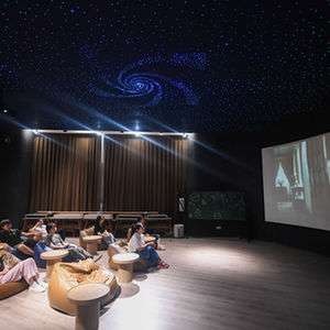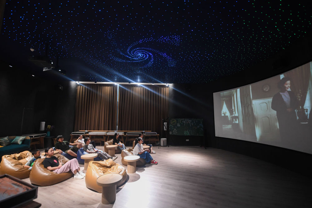 居民在位于浙江省杭州市富阳区银湖街道硅谷社区的“合之舍”书房的影视厅观看电影,该书房是银湖街道“15分钟品质文化生活圈”的示范点位(2022年7月2日摄)。新华社记者 徐昱 摄