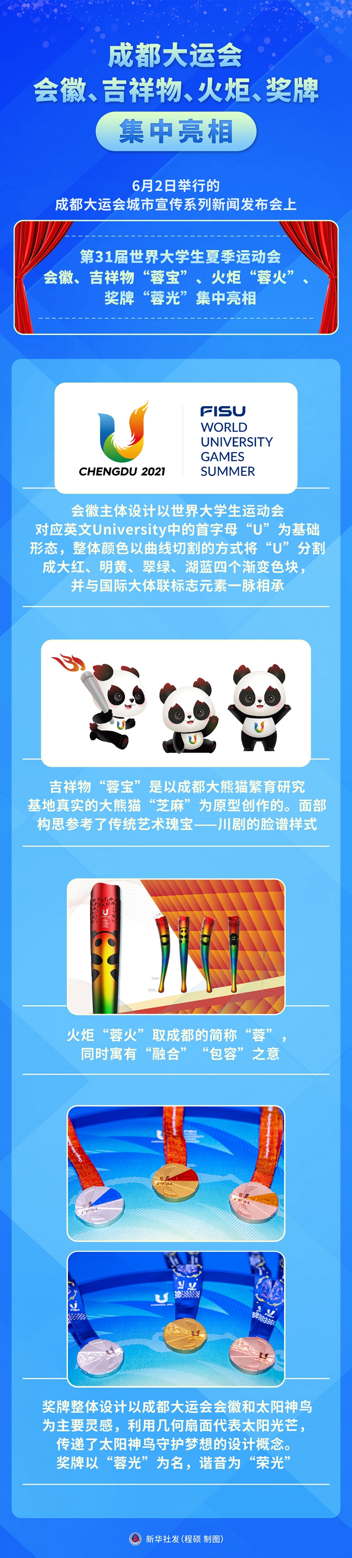 新华社成都6月2日电(记者董小红、陈地)2日举行的成都大运会城市宣传系列新闻发布会上,第31届世界大学生夏季运动会会徽、吉祥物“蓉宝”、火炬“蓉火”、奖牌“蓉光”集中亮相。