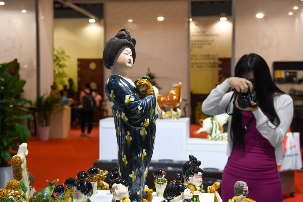 被誉为“东方艺术瑰宝”、迄今已有1300余年历史的“唐三彩”摆件吸引了很多观众的目光,小巧可爱、融合唐朝仕女形象的小型摆件更加受到年轻群体的青睐。唐三彩烧制技艺代表性传承人高水旺说:“我们编写了《唐三彩培训课件》系列教材,开展大中小学研学实践培训,让唐三彩代代传承。”