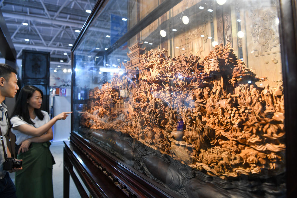 6月8日,观众在文博会上欣赏莆田木雕作品。新华社记者 梁旭 摄