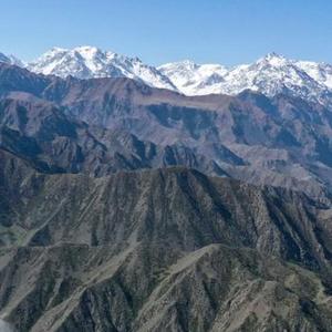 5月11日拍摄的新疆独库公路。海拔较低的山体积雪已消融,远山更高海拔处依旧白雪皑皑(无人机照片)。新华社记者胡虎虎 摄