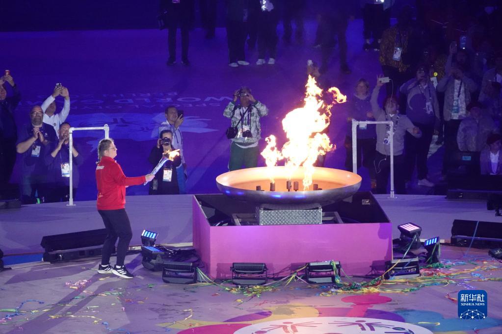 6月17日,德国特奥运动员索菲·伦斯曼点燃圣火。新华社记者 刘旸 摄