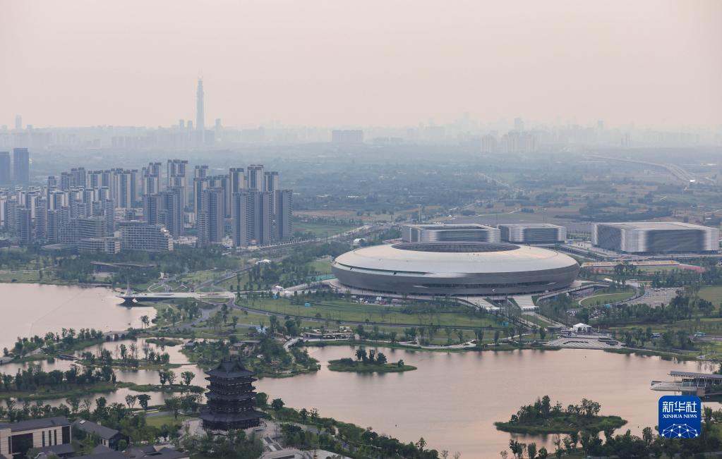 图为俯瞰东安湖体育公园主体育场(左一)、多功能体育馆(右一)、小球馆(右二)、游泳跳水馆(右三)(6月27日摄)。新华社记者 江宏景 摄