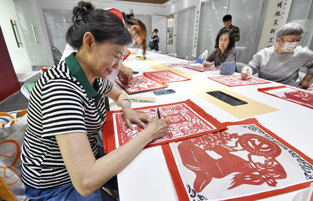 北京朝阳无限社区的老年人在社区养老驿站参加剪纸活动(2023年5月17日摄)。新华社记者 李欣 摄