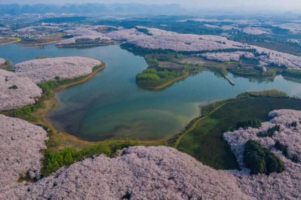 这是2021年3月15日在贵州省贵安新区红枫湖畔拍摄的樱花观光园(无人机照片)。新华社记者 欧东衢 摄