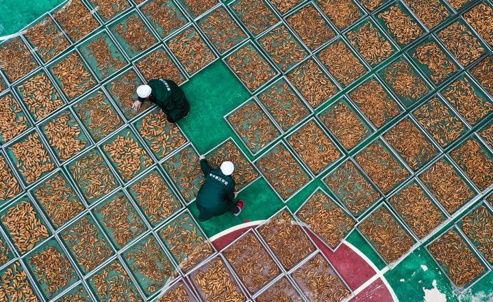 工人在贵州省黎平青江农业开发有限公司晾晒天麻(2022年12月22日摄,无人机照片)。新华社记者 杨文斌 摄