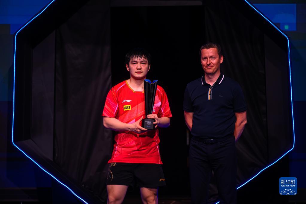 7月9日,樊振东(左)在颁奖典礼上。新华社发(亚卡·埃尔采戈夫切维奇摄)