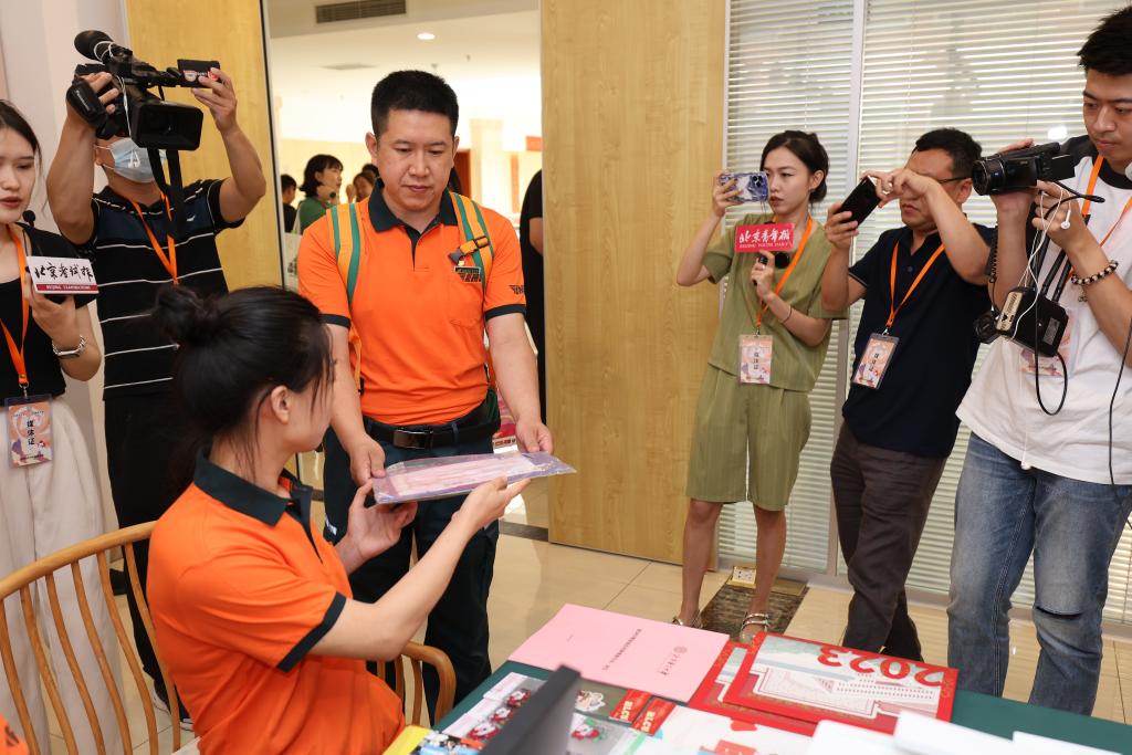 7月7日,在北京语言大学高招录取现场,北京市首封高考录取通知书由北京邮政工作人员封装完毕,交由揽投员史春华出发投递。(北京邮政万宇、吴玉兰供稿)