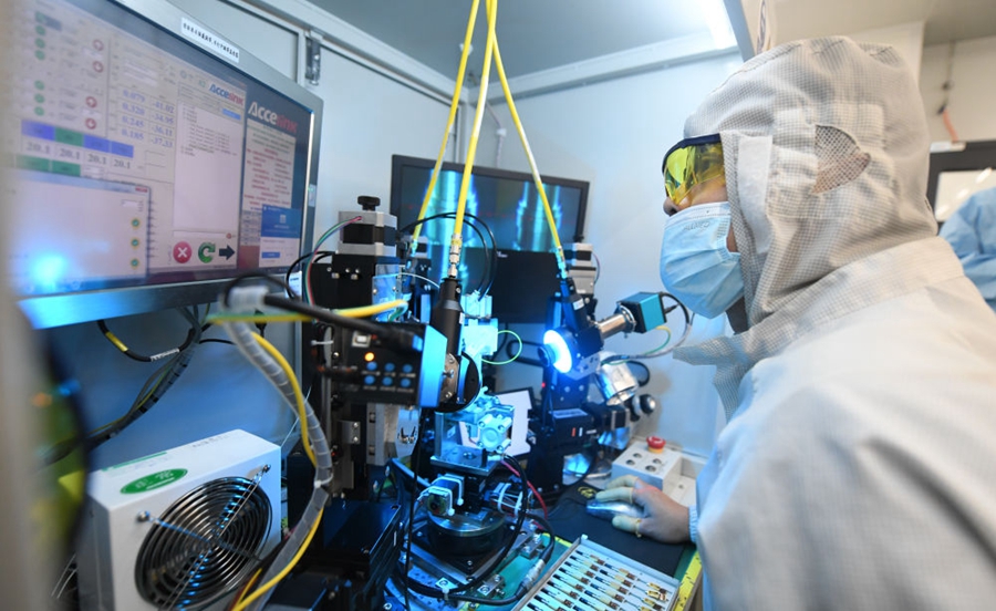 武汉光谷,技术人员在光模块生产线作业 程敏/摄
