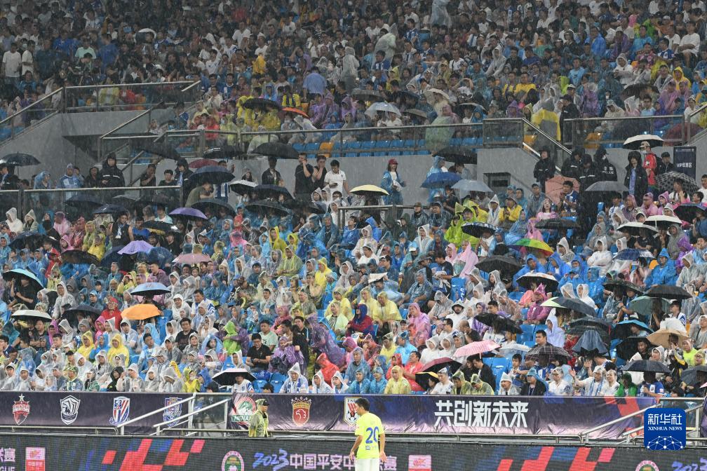 7月21日,在天津泰达足球场,球迷在雨中观赛。