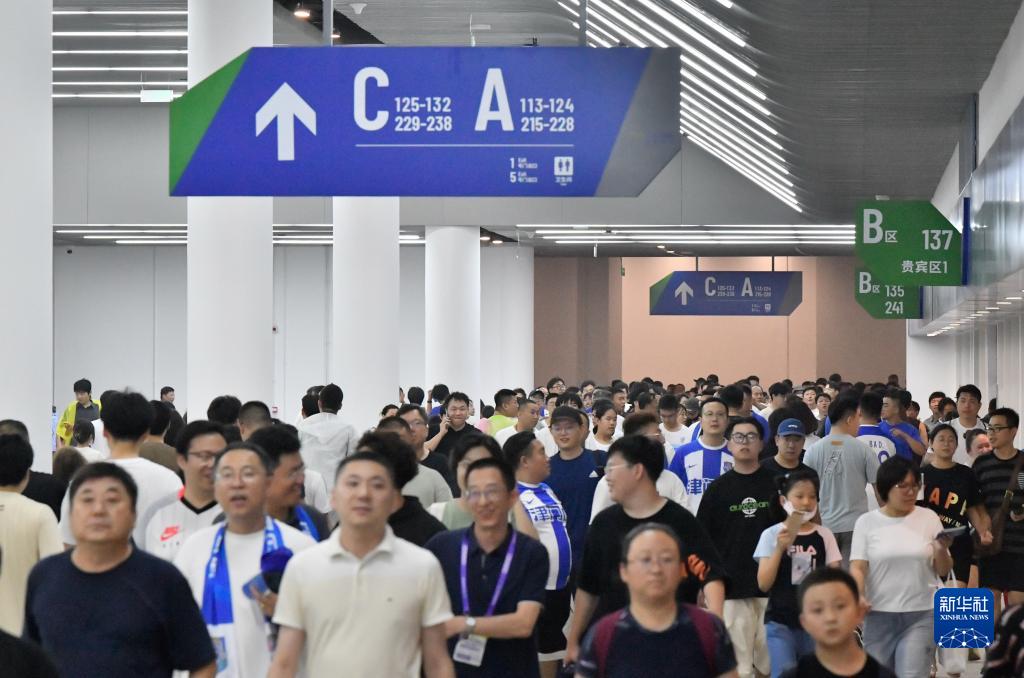 7月21日,球迷通过通道进入天津泰达足球场。