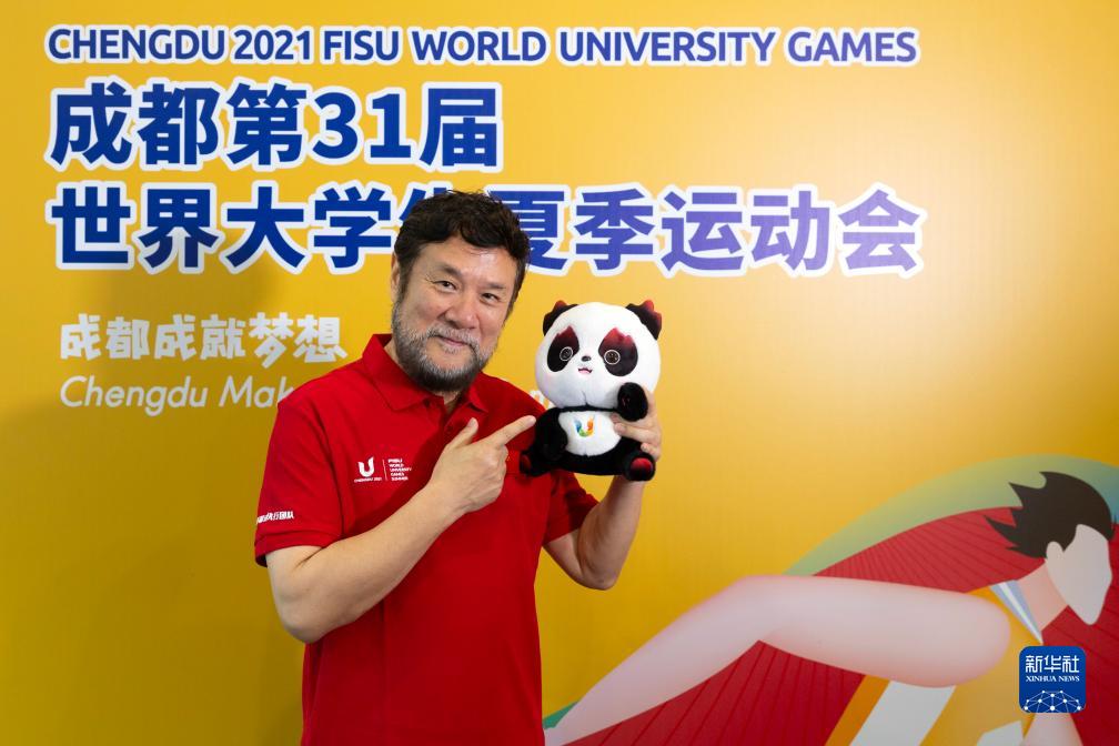大运会开幕式总导演陈维亚接受采访后不忘和“蓉宝”合影,对熊猫和“蓉宝”也是喜爱有加。陈维亚希望将“追求梦想、奋力拼搏、青春友谊”的大运精神融入整个仪式和表演中,向全世界青年奉献一场“阳光灿烂”的开幕式。