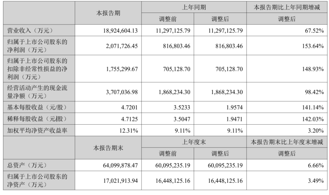 7月26日,宁德时代新能源科技股份有限公司(300750.SZ,简称“宁德时代”)发布2023年半年度报告。报告期内公司实现营业总收入1892.5亿元,同比增长67.5%;归母净利润207.17亿元,同比增长153.64%;基本每股收益4.72元/股。