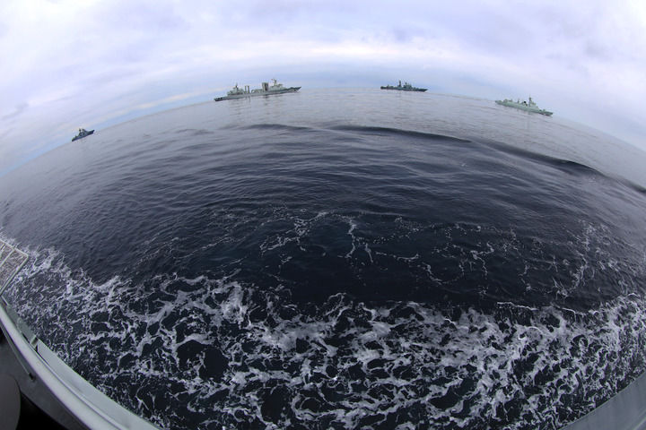 在日本海某海域进行的“北部·联合-2023”演习中,中俄双方舰艇编队航行(2023年7月20日摄)。新华社发(张海龙 摄)