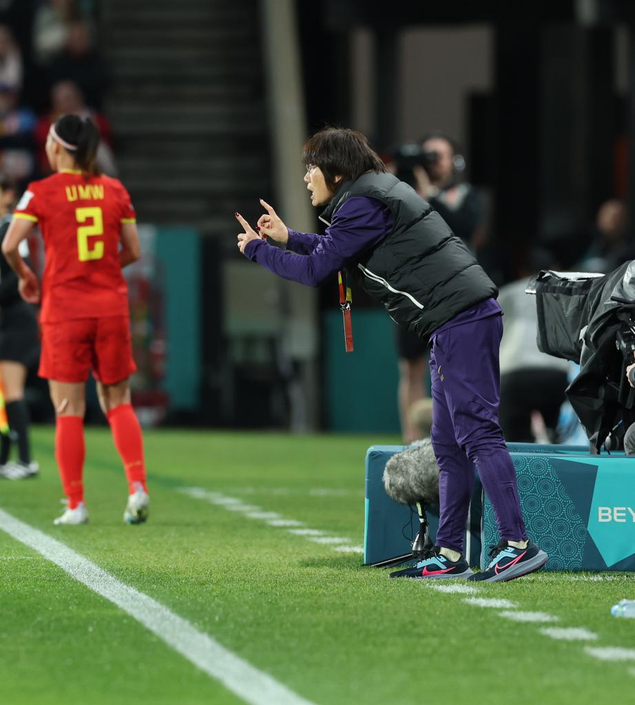 8月1日,中国队主教练水庆霞(右)在场边指挥。新华社记者丁汀摄