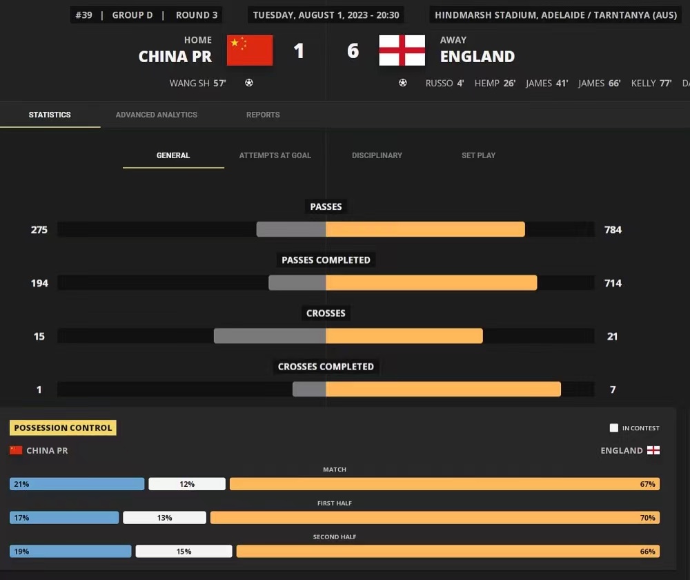 中国队与英格兰队比赛传球、控球率等相关数据。图片来自国际足联