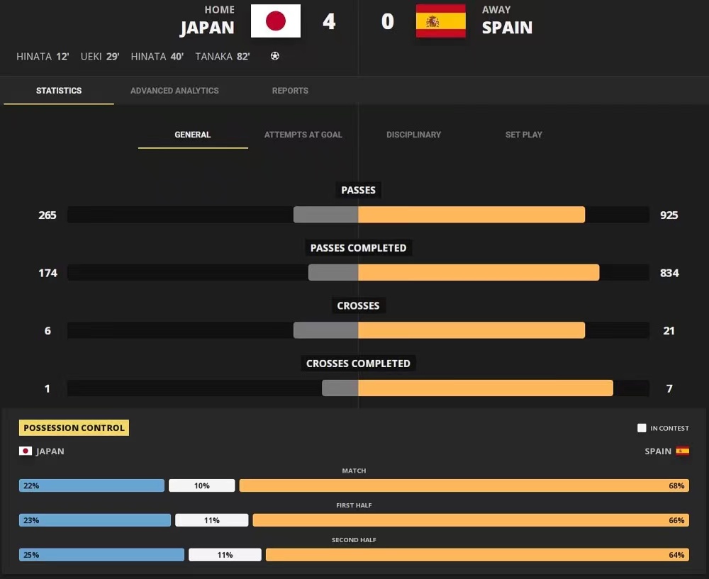 日本队与西班牙队比赛传球、控球率等相关数据。图片来自国际足联