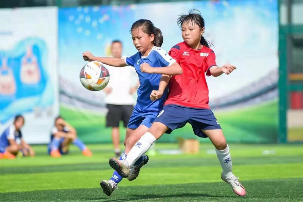 两名小女足队员在一场深圳市中小学生校园足球比赛中拼抢(2021年11月摄)。新华社发