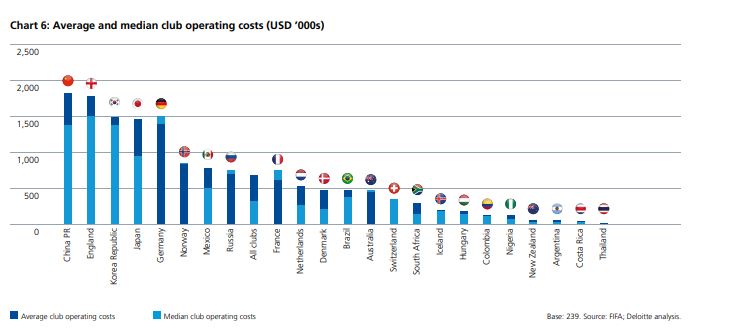 国际足联2021年公布的《全球女足联赛调研报告》中关于世界各地女足联赛投入的统计数据
