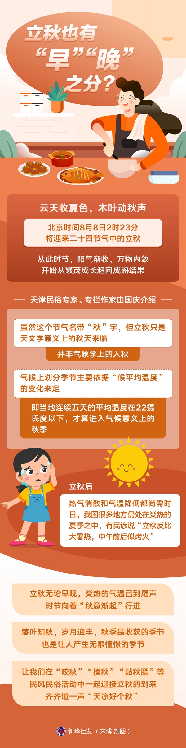 天津民俗专家、专栏作家由国庆介绍,虽然这个节气名带“秋”字,但立秋只是天文学意义上的秋天来临,并非气象学上的入秋。气候上划分季节主要依据“候平均温度”的变化来定,即当地连续五天的平均温度在22摄氏度以下,才算进入气候意义上的秋季。