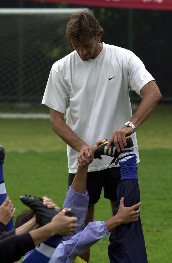 2002年1月24日,时任上海中远队助理教练勒纳尔在帮助队员活动身体。新华社记者姜恩宇摄