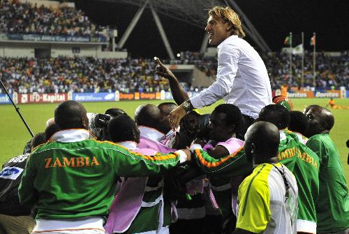 2012年夺得非洲杯冠军后,时任赞比亚队主教练勒纳尔(上)被球员们高高举起。新华社发