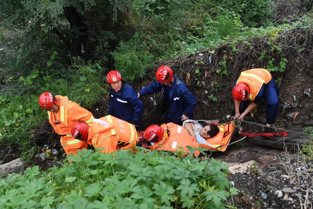 8月1日,在北京市门头沟区水峪嘴村,北京门头沟区消防救援支队的消防员在转运一名受伤村民。新华社记者鞠焕宗 摄