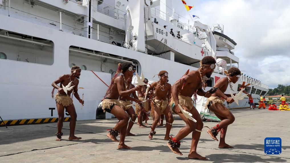 8月19日,中国海军“和平方舟”号医院船抵达所罗门群岛霍尼亚拉港,身着传统服饰的当地民众跳起舞蹈迎接。新华社发(黎宇 摄)