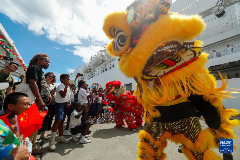 8月19日,中国海军“和平方舟”号医院船抵达所罗门群岛霍尼亚拉港,所中商会组织舞狮表演欢迎中国海军官兵的到来。新华社发(黎宇 摄)