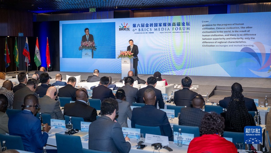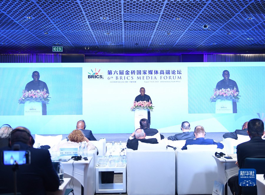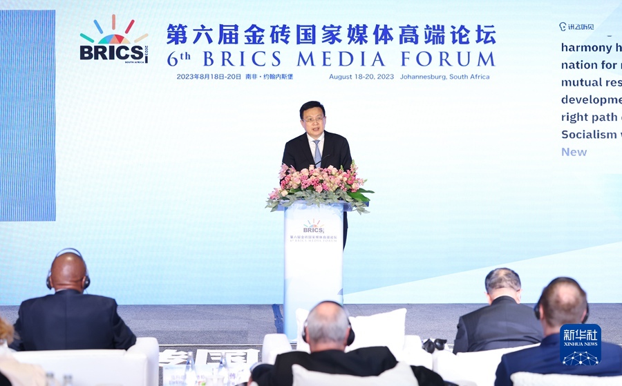 8月19日,金砖国家媒体高端论坛执行主席、新华通讯社社长傅华在第六届金砖国家媒体高端论坛智库报告发布暨研讨会上进行主旨发言。新华社记者 黄敬文 摄