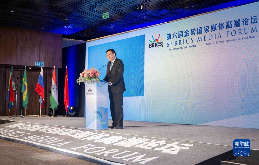 8月19日,金砖国家媒体高端论坛执行主席、新华通讯社社长傅华在第六届金砖国家媒体高端论坛智库报告发布暨研讨会上进行主旨发言。新华社记者 翟健岚 摄
