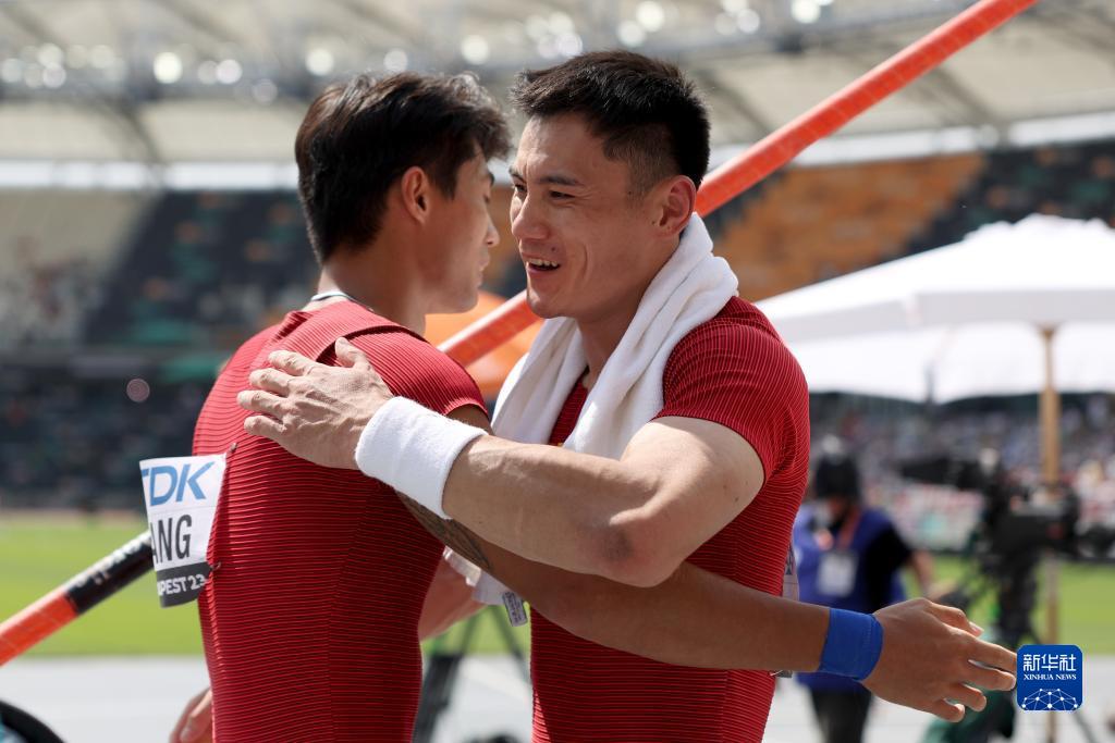 8月23日,黄博凯(左)在资格赛中成功试跳5米75的高度后与姚捷拥抱。新华社记者 李明 摄
